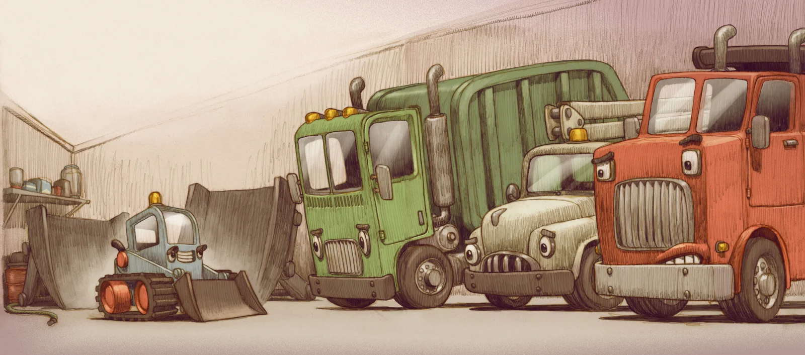 Big trucks may brag and roar, but small and steadfast wins the day in this cheerful story with timeless appeal.